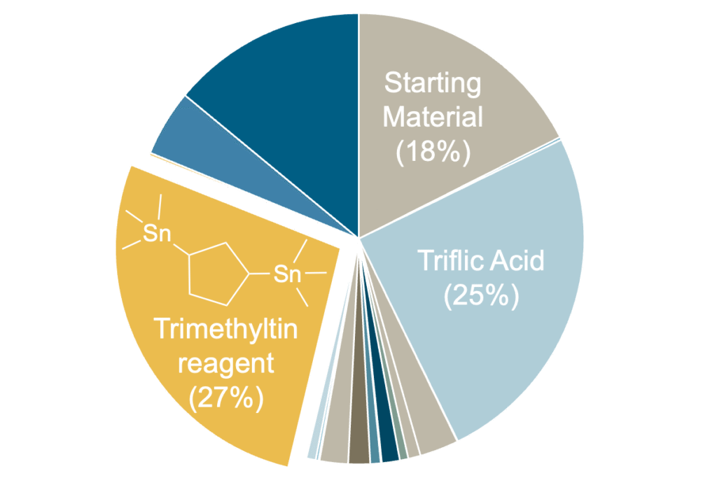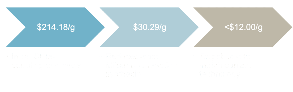 While the efficiency of PTQ10 has neared the potential to compete with traditional solar cells, cost remains a major barrier to commercial viability. Research indicates that the cost of OSCs must decrease to $0.018 Wp-1 (dollars per Watt peak) to match inorganic performance, assuming a 10% scaled-up module efficiency.2 To meet this, the organic polymer contributing to the cell must cost less than $12 g-1. Although PTQ10 has a simple synthesis pathway, total cost was calculated to be $214.18 g-1. The expense of this synthesis is due to its reliance on expensive starting materials and non-scalable reaction conditions. An updated synthesis route from Rech et al decreases the cost to $30.29 g-1 by using a Mitsunobu reaction to add the side chains and a newly redesigned and commercially available starting material. However, this work still relies on the Stille coupling for the polymerization. Over 25% of the overall cost of PTQ10 through this new synthetic approach comes from the trimethyltin chloride reagent used to make the Stille monomer. An alternative polymerization pathway could reduce the cost towards the target of $12 g-1.